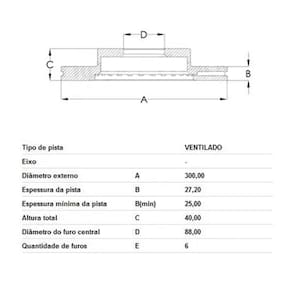 CARACTERÍSTICAS: Dianteiro Ventilado SEM Cubo Diâmetro externo A 300,00 Espessura da pista B 27,20 Espessura mínima da pista TH(min) 25,00 Altura total C 40,00 Diâmetro do furo central D 88,00 Quantidade de furos E 6