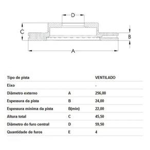 CARACTERÍSTICAS: Ventilado Dianteiro Sem Cubo Diâmetro externo A 256,00 Espessura da pista B 24,00 Espessura mínima da pista TH(min) 22,00 Altura Total C 45,50 Diâmetro do furo central D 59,50 Quantidade de furos E 4