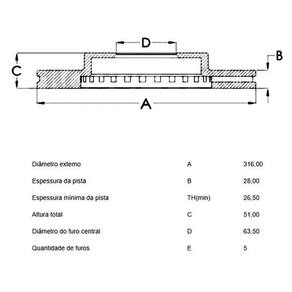 CARACTERÍSTICAS: Traseiro Sem Cubo Diâmetro externo A 270 Espesurra da pista B 10 Espessura mínima da pista TH(min)8 Altura total C 37 Diâmetro do furo central D 55 Quantidade de furos E 5