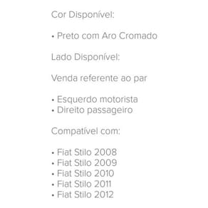 Descrição do produtoPar grade moldura farol milha stilo 2008 09 10 11Mais informaçõesMarca: 67781Descrição completaPar grade moldura farol milha stilo 2008 09 10 11 cromado Cor disponível: Preto com aro cromadoLado disponível:Venda referente ao par Esquerdo motorista Direito passageiroCompatível com: Fiat stilo 2008 Fiat stilo 2009 Fiat stilo 2010 Fiat stilo 2011 Fiat stilo 2012Especificação técnica: Fabricado em plástico resistente Acabamento perfeito Fácil instalação Alta durabilidade Grade na cor preta Aro cromado Encaixe sob medida Pode ser pintada na cor do veículo Modelo com furo para farol de milhaConteúdo da embalagem: 02 grade do milha cromadaImportante: Garantia de 3 meses. Valor referente ao parRecomendamos que a instalação seja feita por profissional especializado e não nós responsabilizamos pelo mau uso do produto.Agradecemos a sua visita Marca: 67781