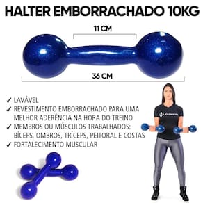 O par de halter é fabricado em ferro fundido e revestido com PVC com os mais exigentes padrões de qualidade e com alta tecnologia. Os halteres são emborrachados para uma melhor aderência na hora do treino. Tem sua superfície impermeável e possui uma variação de peso de acordo com a necessidade do usuário. Com o revestimento em PVC você terá muito mais conforto e higiene na utilização do produto. Possui um tamanho proporcional para o encaixe perfeito em suas mãos, oferecendo melhor conforto na hora da execução dos exercícios.