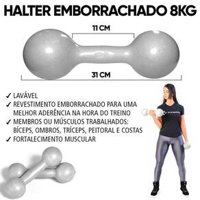 O par de halter é fabricado em ferro fundido e revestido com PVC com os mais exigentes padrões de qualidade e com alta tecnologia. Os halteres são emborrachados para uma melhor aderência na hora do treino. Tem sua superfície impermeável e possui uma variação de peso de acordo com a necessidade do usuário. Com o revestimento em PVC você terá muito mais conforto e higiene na utilização do produto. Possui um tamanho proporcional para o encaixe perfeito em suas mãos, oferecendo melhor conforto na hora da execução dos exercícios. ?Características:?Cor: Enviado de acordo com a disponibilidade de estoque?Material: Ferro fundido revestido em PVC?Lavável: Sim?Peso: 8kg cada (Total 16kg) Lugares ideais para utilização:?CasaEstúdiosAcademiaClinicas de PilatesFisioterapiaCondomínios Cuidados com o produto:Não jogar no chão.Limpeza com água e álcool, 50% de cada Garantia:90 dias de garantia por conta de defeito de fabricação FAQ - Perguntas Frequentes 1- Qual é o material do halter emborrachado?O halter é feito de ferro fundido revestido com uma camada de borracha resistente, proporcionando durabilidade e aderência confortável durante o uso. ?2- Para que tipo de exercícios os halteres emborrachados são ideais?Os halteres emborrachados são ideais para uma variedade de exercícios de musculação, como levantamento de peso livre, exercícios de tonificação muscular e treinos de resistência. ?3- Qual é o benefício do revestimento de borracha nos halteres?O revestimento de borracha oferece proteção contra danos ao piso e reduz o ruído durante os exercícios, além de proporcionar uma aderência segura e confortável. 4- Como posso limpar e manter meu halter emborrachado?Para manter seu halter emborrachado em boas condições, limpe-o regularmente com um pano úmido e suave. Evite o uso de produtos químicos agressivos que possam danificar o revestimento de borracha. 5- Esse halter emborrachado é adequado para uso doméstico ou profissional?Nossos halteres emborrachados são projetados para serem duráveis o suficiente para uso tanto em ambientes domésticos quanto profissionais, como academias e estúdios de fitness. Marca: Não Informado