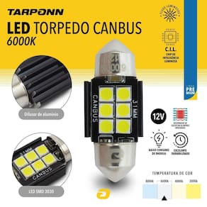 Características:brbaixo consumobrDurabilidade superiorbrIluminação branca friabrFácil instalaçãobrAlta potênciabrAplicação: Luz de teto, porta-malas, porta-luvas e placabrbrO top da qualidade máxima é aqui com a Lâmpada Tarponn LED Torpedo Canbus Premium 41MM 12v 6000kbrModelo Premium, possui uma tecnologia especial de lâmpada LED automotiva e ainda conta com aletas de alumínio de aviação na parte traseira, funcionando como difusor de calor, deixando o circuito mais refrigerado e aumentando a sua vida útil.brindicada para a iluminação de ambientes internos, como luz de teto, porta malas, porta luvas e placa, possui 6 LEDS de última geração, levando toda a elegância, sofisticação e modernidade para você. Para quem busca o máximo em qualidade e perfeição, a Lâmpada Tarponn LED Torpedo Canbus Premium 41MM 12v 6000k é a melhor escolhabrbrbrFicha técnica:brCor: Branca friabrTemperatura de Cor 6000kbrEncaixe: TorpedobrTensão: 12vbrEquivalência: 10wbrTipo de LED: SMD 3030brLinha: PremiumbrFluxo luminoso: 360 ImQuem somos:Somos a Mega GT especialistas na linha de Acessórios Automotivos e Utilidades para a sua casa. Buscamos sempre oferecer para o nosso cliente a melhor opção com o preço justo na sua compra.4- Tem garantiaSim, os produtos têm garantia de 3 meses. Ean: 7900469450633
