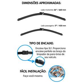 ESPECIFICAÇÕES TÉCNICAS: - Haste em plástico semirrigido que se ajusta ao vidro; - Fita de borracha; - Proporciona maior aderência e limpeza; - Evita riscos no vidro; - Menos ruídos no seu funcionamento; - Fácil de instalar; - Excelente durabilidade e acabamento; - Lado do motorista com 26 Polegadas 660mm ; - Lado do passageiro com 17 Polegadas 430mm ; - Para veículos com encaixe tipo SL1; - Substitui a palheta convencional; - Peso: 200 gramas.