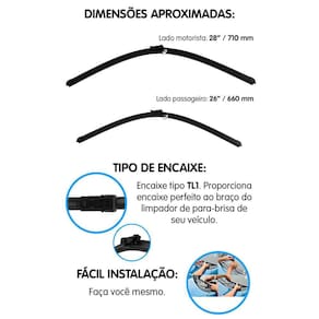 ESPECIFICAÇÕES TÉCNICAS: - Haste em plástico semirrigido que se ajusta ao vidro; - Fita de borracha; - Proporciona maior aderência e limpeza; - Evita riscos no vidro; - Menos ruídos no seu funcionamento; - Fácil de instalar; - Excelente durabilidade e acabamento; - Lado do motorista com 28 Polegadas 710mm ; - Lado do passageiro com 26 Polegadas 660mm ; - Para veículos com encaixe tipo TL1; - Substitui a palheta convencional; - Peso: 200 gramas.