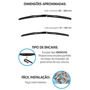 ESPECIFICAÇÕES TÉCNICAS: - Haste em plástico semirrigido que se ajusta ao vidro; - Fita de borracha; - Proporciona maior aderência e limpeza; - Evita riscos no vidro; - Menos ruídos no seu funcionamento; - Fácil de instalar; - Excelente durabilidade e acabamento; - Lado do motorista com 24 Polegadas 600mm ; - Lado do passageiro com 16 Polegadas 410mm ; - Para veículos com encaixe tipo Gancho; - Substitui a palheta convencional; - Peso: 200 gramas.