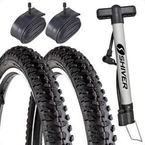 ITENS INCLUSOS: 2 Unidades pneu Levorin Excess Ex 26x1.95 cravudo 2 Unidades carama de ar Shiver aro 26 33mm bico grosso 1 Unidade bomba de ar manual Shiver 30cm