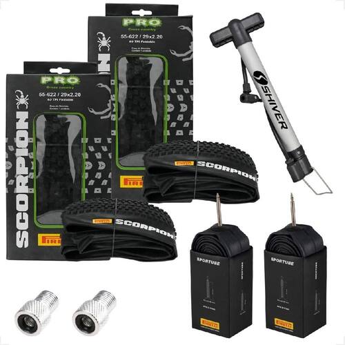 PAR PNEU KEVLAR PIRELLI TUBELESS ARO 29 X 2.20 SCORPION PRO + PAR CAMARA DE AR PIRELLI ARO 29 SPORTUBE + PAR ADAPTADOR VALVULA BICO FINO PARA GROSSO + BOMBA DE AR MANUAL SHIVER 30CM