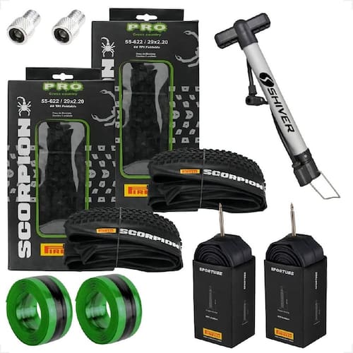 ITENS INCLUSOS: 2 UNIDADES PNEU PIRELLI SCORPION ARO 29X2.20 KEVLAR 2 UNIDADES CAMARA DE AR ARO 29 VALVULA PRESTA 48MM SPORTUBE 2 UNIDADES BICO ADAPTADOR VALVULA PRESTA BICO FINO PARA GROSSO 2 UNIDADES FITA ANTI FURO TECTIRE 1 UNIDADE BOMBA DE AR SHIVER MANUAL 30 CM