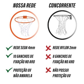 Durabilidade: fabricada em polietileno, material resistente ao uso frequente. Fácil instalação: conta com 10 alças que facilitam a fixação no aro. Versátil: pode ser utilizada em tabelas de basquete residenciais, escolares ou em áreas de lazer. Custo-benefício: ideal para quem deseja qualidade com preço acessível. Design clássico: cor branca que combina com qualquer tipo de tabela ou estrutura.