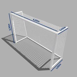 - Dimensões: 4,20m na largura, 2,30m de altura, 1,00m de recuo superior e 1,00m de recuo inferior; - Malha Distância entre nós : 15x15cm; - Fio: Confeccionada com fio 2mm de polietileno de alta densidade - 100% virgem, com tratamento contra as ações do tempo U.V ; - Cor: Branca.