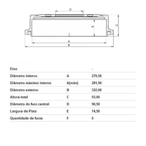CARACTERÍSTICAS: Traseiro Sem Cub Diâmetro interno A 279,50 Diâmetro máximo interno TH(min) 281,50 Diâmetro externo B 322,00 Altura total C 93,00 Diâmetro do furo central D 90,50 Largura da pista E 74,50 Quantidade de furos F 6