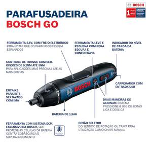A Parafusadeira Bosch Go a Bateria de 3,6V BIVOLT com bateria integrada e autonomia de 1,5Ah é a evolução da chave de fenda! A primeira parafusadeira inteligente do mundo com o inovador Sistema Push&Go. Basta pressionar para parafusar. Compacta, leve e potente, com 6 opções de configuração de torque para o seu trabalho. A entrada USB é compatível com o carregador do seu celular!