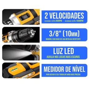 Diâmetro do mandril: 3/8 10 mm - Aperto rápido. Velocidade: Variável e reversível. Torque: 17 + 1 opções. Torque máximo: 32 N.M. Bateria: 1.300 mAh 2 baterias inclusas . Voltagem: Bivolt.