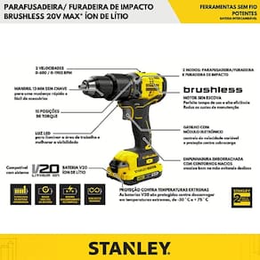 Parafusadeira E Furadeira de Impacto Brushless 1/2 13mm 20 Volts Max Bivolt Com 2 Baterias + Maleta - Sbd715d2k-br - Stanley Paraf/furad Impacto 1/2 13mm 20v Max Biv 2bat Parafusadeira e Furadeira de Impacto Brushless 1/2 13mm 20 Volts Max Bivolt com 2 Baterias + Maleta - SBD715D2K-BR - STANLEY Descrição: A Parafusadeira/Furadeira de Impacto faz parte do sistema V20, que permite usar a mesma bateria com toda as novas ferramentas do sistema V20. Oferece um excelente desempenho que os profissionais mais exigentes precisam em suas aplicações. Motor Brushless sem escova de carvão oferece vantagens significativas quando comparados com modelos com escovas. Mais potência os motores Brushless não perdem energia no atrito ou calor, fornecendo mais performance, maior duração e um consumo menor de energia. Compacta e leve seu tamanho e consideravelmente reduzido graças a essa tecnologia.