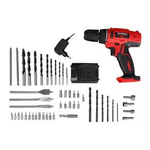 - 1 Extensor magnético de bits. - 5 Bits phillips. - 5 Bits fenda. - 7 Bits allen. - 7 Bits torx. - 1 Bit phillips longo. - 1 Bit fenda longo. - 6 Brocas para metal. - 10 Brocas para madeira. - 3 Brocas chatas 12, 16, 20mm . - 4 Chaves Soquetes 6, 8, 10 e 12mm .