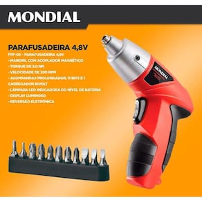 Seja um profissional na sua própria casa. A parafusadeira 4,8V Recarregável da Mondial é a ferramenta mais versátil. Ela possui mandril com fixador magnético, torque de 3Nm para remover parafusos facilmente, Velocidade de 200rpm para que você possa realizar diversos tipos de serviços tranquilamente, display luminoso que indica o nível de bateria, lâmpada Led para facilitar o trabalho em pontos mais escuros, reversão eletrônica permitindo o giro para os dois lados e bateria interna proporcionando mais mobilidade no manuseio. Além disso, a Parafusadeira 4,8V é à bateria, chega de fios.