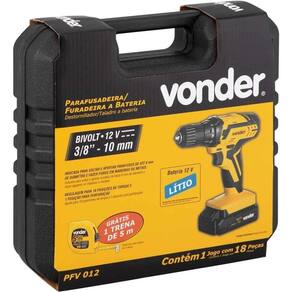 Conteúdo da embalagem: 1 Parafusadeira/furadeira. Acompanha: 1 maleta, 1 bateria de 12 V, 1 fonte de carregamento bivolt automática, 6 brocas de aço rápido (1,5 mm, 2,5 mm, 3,0 mm, 4,0 mm, 5,0 mm e 6,0 mm), 6 bits (2 fendas (5 mm e 6 mm), 2 phillips (PH1 e PH2) e 2 pozidrive (PZ1 e PZ2)), 1 soquete magnético encaixe de 1/4 e 1 trena de 5 m.