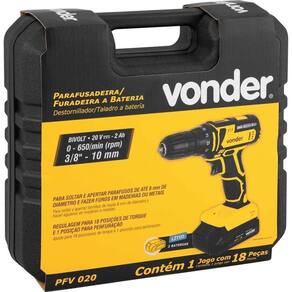 Conteúdo da embalagem: 1 Parafusadeira/furadeira. Acompanha: 1 maleta, 2 baterias de 20 V, 1 fonte de carregamento bivolt automática, 6 brocas de aço rápido (1,5 mm, 2,5 mm, 3,0 mm, 4,0 mm, 5,0 mm e 6,0 mm), 6 bits (2 fendas (5 mm e 6 mm), 2 phillips (PH1 e PH2) e 2 pozidrive (PZ1 e PZ2)) e 1 soquete magnético encaixe de 1/4 + 1 bits ponta dupla (ponta PH2 e ponta fenda 5.5 mm).