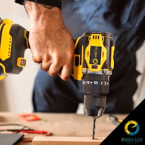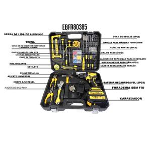 Acompanha na maleta (EBFR80385): - 1 Furadeira/parafusadeira EmbuLED 21V - 2 Baterias recarregáveis - 1 Carregador bivolt - Serra de alumínio - Trena, estilete e fita isolante - Conjunto de brocas (6 pcs) e pontas (6 pcs) - Chaves de fenda, chave meia-lua, chave ajustável - Alicates (universal e bico fino) - Mini chaves de precisão (4 pcs) - Caneta testadora de tensão - Soquetes, bits, conectores, acessórios e lâminas extras