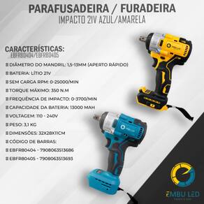 Acompanha na maleta (EBFR80404): - 1 Parafusadeira/Furadeira de Impacto EmbuLED 21V - 2 Baterias recarregáveis - 1 Carregador bivolt - Conjunto de brocas (6 pcs) - Conjunto de pontas (6 pcs) - Conjuntos de soquetes (4 pcs e 5 pcs – 14 a 22mm) - Soquete de impacto, chave e conversor para mandril - Eixo flexível universal - Lubrificante e acessórios extras