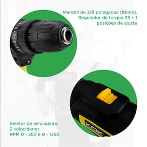 Furadeira e Parafusadeira KOKAY 2 Velocidades - Sem Fio, 1300 mAh A furadeira e parafusadeira sem fio da KOKAY, modelo SC-95, foi projetada para combinar precisão e praticidade em uma única ferramenta robusta e fácil de manusear. Com 2 velocidades ajustáveis 0-350 RPM e 0-1350 RPM , esta ferramenta atende tanto a trabalhos leves quanto a tarefas mais intensas. Conta com uma bateria de Íons de Lítio de 12V e capacidade de 1300 mAh, que oferece até 300 ciclos de recarga sem efeito memória, garantindo maior vida útil. O modelo é equipado com 25 + 1 posições de torque, proporcionando flexibilidade para diferentes tipos de materiais e aplicações. Um diferencial importante é a luz de LED, que auxilia em ambientes com pouca luminosidade, além da bateria removível com indicador de carga. Especificações Técnicas: - Velocidade: 2 modos 0-350 RPM e 0-1350 RPM - Capacidade da Bateria: 1300 mAh, 12V Íons de Lítio - Ciclos de Recarga: 300 ciclos sem efeito memória - Torque: 25 + 1 posições de ajuste - Diâmetro do Mandril: 3/8 10 mm - Luz de LED: Sim, para uso em baixa luminosidade - Bateria Removível: Sim, com indicador de carga - : 1 ano Itens Inclusos na Maleta: 1. Furadeira e Parafusadeira sem fio 12V Modelo SC-95 2. Maleta Plástica 3. Kit de Brocas 4. Kit de Bits para Parafusar 5. Prolongador 6. Bateria de Íons de Lítio 12V 7. Carregador Bivolt 8. Manual de Instruções