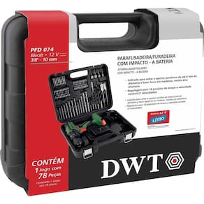 Destaques: Acompanha 74 acessórios encaixados perfeitamente na maleta, conferindo organização, praticidade e maior vida útil dos acessórios. Possui regulagem para 18 posições de torque e velocidade variável (2 velocidades). Contém 3 funções de operação: parafusadeira, furadeira sem impacto e furadeira com impacto. Possui LED para melhor visibilidade do local de trabalho, indicador de carga da bateria, cabo com revestimento emborrachado proporcionando maior conforto ao operador, bateria de íons de lítio que confere alta eficiência de operação, além de fonte bivolt automático.
