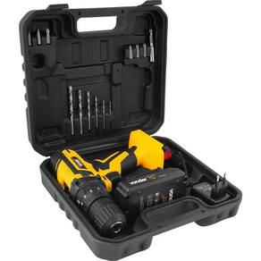 Destaques e diferenciais: Acompanha 16 acessórios encaixados perfeitamente na maleta, conferindo organização, praticidade e maior vida útil dos acessórios. Possui regulagem para 18 posições de torque e velocidade variável (2 velocidades). Contém 3 funções de operação: parafusadeira, furadeira sem impacto e furadeira com impacto. Possui LED para melhor visibilidade do local de trabalho, indicador de carga da bateria, cabo com revestimento emborrachado proporcionando maior conforto ao operador, bateria de íons de lítio que confere alta eficiência de operação, além de carregador bivolt automático com tensão de entrada de 100 V - 240 V