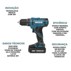 Parafusadeira furadeira impcto 18v ws2390 wesco + kit 18 pçs Parafusadeira e furadeira de impacto com 18v modelo ws2390 - 13 mm + kit com 18 peças mtx