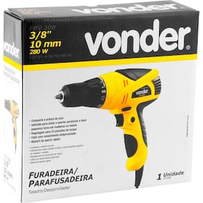 Parafusadeira Furadeira Profissional Fpv300 - Mandril 10mm - VonderIndicada para soltar e apertar parafusos e fazer pequenos furos em madeiras ou metais. Não indicada para uso em concreto.Compacta e prática de usar. Possui regulagem de torque em 23 posições, adequando-se à necessidade de aperto de acordo com a dureza do material. Cabo com revestimento emborrachado para maior conforto do operador, além de dupla isolação, garantindo maior segurança. Possui ainda, mandril de aperto rápido proporcionando troca rápida do acessório utilizado.