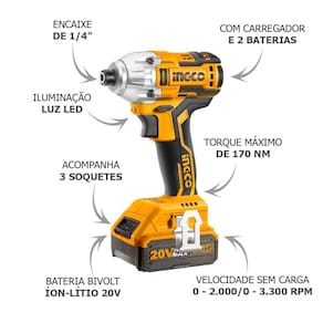 - 1 Parafusadeira de Impacto 1/4" Íon-Lítio 20V Ingco