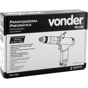 Marca: VonderConteúdo da embalagem:1 Parafusadeira. Acompanha: 1 gancho para balancim e 1 chave para ajuste do torque.Destaques e diferenciais:Possui ajuste de torque, fácil acesso a mudança no sistema de reversão e silenciador. Conta com sistema de troca rápida dos bits e desligamento automático Shut-off , garantindo maior segurança e agilidade na operação. Conta com acionamento por gatilho. Ergonômica, proporciona conforto e praticidade ao operador.Aplicações e dicas de uso:Indicada para diversas operações de aperto e desaperto de parafusos e porcas em geral. Uso industrial. Mantenha a ferramenta constantemente lubrificada e utilize sempre o regulador e o lubrificador de linha com óleo pneumático. .Detalhes TécnicosModelo: PPV358 Consumo de ar: 2,1 pcm pé/min Pressão de trabalho: 90 lbf/pol Tipo do encaixe da parafusadeira: Sextavado - 1/4 - 6,35 mm Tipo de acionamento: Acionamento por gatilho Sistema de reversão: Sim Rotações por minuto rpm : 1.000/min Torque: 3,5 N.M - 8,0 N.M Rosca de entrada de ar: 1/4 NPT fêmea Diâmetro da mangueira: 3/8 Aceleração transmitida nas mãos - braços do operador - ah: 0,61 m/s Incerteza da aceleração transmitida nas mãos - braços do operador - k: 0,56 m/s Massa aproximada peso kg : 1,236 kg - E CDC : legal: 90 dias + contratual: 3 meses Para locadoras, única e exclusiva de 90 dias Marca: Não Informado Ean: 7893946691929