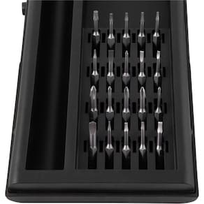 1 Parafusadeira de precisão a bateria. Acompanha: 1 estojo com magnetizador/desmagnetizador, 1 cabo para carregamento (USB), 2 bits estrela (P, 2 P5), 1 bits triângulo (?3.0), 2 bits Allen (1,5 mm, 2 mm), 5 bits Phillips (PH0000, PH000, PH00, PH0 e PH1), 3 bits fenda (1,5 mm, 2 mm e 2,5 mm), 3 bits hexalobular (T2, T3 e T4), 3 bits hexalobular com furo (T5, T6 e T8) e 1 bits Y (Y0,6).