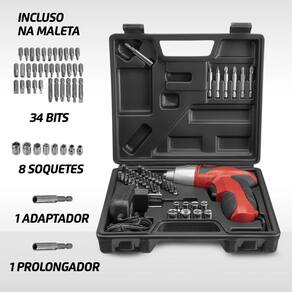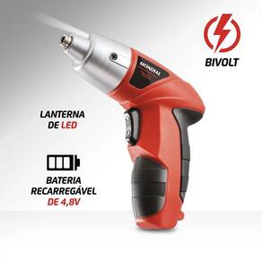 Com BATERIA RECARREGÁVEL BIVOLT, a Parafusadeira Recarregável 4,8V FPF-05M vermelha é portátil de verdade e acompanha uma MALETA COM ACESSÓRIOS. Ela ainda tem REVERSÃO ELETRÔNICA, LANTERNA LED E 200 RPM DE VELOCIDADE. Ela é portátil porque tem BATERIA DE 4,8V BIVO LT, que pode ser recarregada tanto em tomada de 110V quanto em 220V, e o indicador de bateria avisa quando é a hora de carregar. Ela acompanha uma MALETA, com 1 prolongador, 34 bits, 8 soquetes e 1 adaptador. É o KIT COMPLETO para fazer qualquer trabalho. Com VELO CIDADE DE 200 RPM, ela é mais rápida. Seu MANDRIL TEM FIXADOR MAGNÉTICO, fazendo ela ser MAIS PRÁTICA ao usar e na hora de trocar as brocas. Já seu TORQUE É 3,0 Nm, o que dá mais força. Com a REVERSÃO ELETRÔNICA, você pode reverter o sentido de giro do motor. E a LANTERNA DE LED da Parafusadeira Recarregável 4,8V FPF05M deixa fácil trabalhar até em lugares escuros. Tudo com a QUALIDADE MONDIAL , garantia de fábrica. A Mondial é a escolha de milhões de consumidores.
