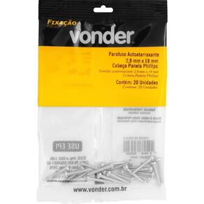 Marca: VonderConteúdo da Embalagem:1 Cartela com 20 parafusosDestaques e diferenciais:Possui acabamento zincado que aumenta a resistência contra corrosão/oxidação, além de cabeça tipo phillips, que proporciona maior força de aperto e menor possibilidade da chave ou bits escapar e riscar a peça que está sendo trabalhada.Aplicações e dicas de uso:Indicado para fixações de acessórios e objetos em paredes de alvenaria e concreto com buchas de fixação. Permite fixações em móveis tubulares, equipamentos fabricados com chapas metálicas finas e esquadrias de alumínio. Muito utilizado na fabricação de móveis em madeira e MDF.Características Técnicas:Material do parafuso autoatarraxante: Aço carbono Acabamento do parafuso autoatarraxante: Zincado Diâmetro da rosca do parafuso autoatarraxante: 2,9 mm Comprimento do parafuso autoatarraxante: 19,0 mm Tipo da cabeça do parafuso autoatarraxante: Panela Tipo da fenda do parafuso autoatarraxante: Phillips fenda cruzada Marca: Não Informado Ean: 7893946625320