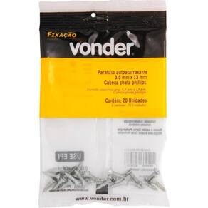 Marca: VonderConteúdo da Embalagem:1 Cartela com 20 parafusosDestaques e diferenciais:Possui acabamento zincado que aumenta a resistência contra corrosão/oxidação. Conta com cabeça chata/cônica que oferece acabamento rente à superfície.Aplicações e dicas de uso:Indicado para fixações de acessórios e objetos em paredes de alvenaria e concreto com buchas de fixação. Permite fixações em móveis tubulares, equipamentos fabricados com chapas metálicas finas e esquadrias de alumínio. Muito utilizado na fabricação de móveis em madeira e MDF.Características Técnicas:Material do parafuso autoatarraxante: Aço carbono Acabamento do parafuso autoatarraxante: Zincado Diâmetro da rosca do parafuso autoatarraxante: 3,5 mm Comprimento do parafuso autoatarraxante: 13,0 mm Tipo da cabeça do parafuso autoatarraxante: Chata Tipo da fenda do parafuso autoatarraxante: Phillips fenda cruzada