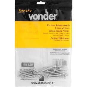 Marca: VonderConteúdo da Embalagem:1 Cartela com 20 parafusosDestaques e diferenciais:Possui acabamento zincado que aumenta a resistência contra corrosão/oxidação, além de cabeça tipo phillips, que proporciona maior força de aperto e menor possibilidade da chave ou bits escapar e riscar a peça que está sendo trabalhada.Aplicações e dicas de uso:Indicado para fixações de acessórios e objetos em paredes de alvenaria e concreto com buchas de fixação. Permite fixações em móveis tubulares, equipamentos fabricados com chapas metálicas finas e esquadrias de alumínio. Muito utilizado na fabricação de móveis em madeira e MDF.Características Técnicas:Material do parafuso autoatarraxante: Aço carbono Acabamento do parafuso autoatarraxante: Zincado Diâmetro da rosca do parafuso autoatarraxante: 3,5 mm Comprimento do parafuso autoatarraxante: 25,0 mm Tipo da cabeça do parafuso autoatarraxante: Panela Tipo da fenda do parafuso autoatarraxante: Phillips fenda cruzada