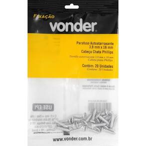 Marca: VonderConteúdo da Embalagem:1 Cartela com 20 parafusosDestaques e diferenciais:Possui acabamento zincado que aumenta a resistência contra corrosão/oxidação. Conta com cabeça chata/cônica que oferece acabamento rente à superfície.Aplicações e dicas de uso:Indicado para fixações de acessórios e objetos em paredes de alvenaria e concreto com buchas de fixação. Permite fixações em móveis tubulares, equipamentos fabricados com chapas metálicas finas e esquadrias de alumínio. Muito utilizado na fabricação de móveis em madeira e MDF.Características Técnicas:Material do parafuso autoatarraxante: Aço carbono Acabamento do parafuso autoatarraxante: Zincado Diâmetro da rosca do parafuso autoatarraxante: 3,9 mm Comprimento do parafuso autoatarraxante: 16,0 mm Tipo da cabeça do parafuso autoatarraxante: Chata Tipo da fenda do parafuso autoatarraxante: Phillips fenda cruzada Marca: Não Informado Ean: 7893946627492
