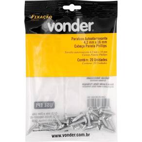 Marca: VonderConteúdo da Embalagem: 1 Cartela com 20 parafusosDestaques e diferenciais:Possui acabamento zincado que aumenta a resistência contra corrosão/oxidação, além de cabeça tipo phillips, que proporciona maior força de aperto e menor possibilidade da chave ou bits escapar e riscar a peça que está sendo trabalhada.Aplicações e dicas de uso:Indicado para fixações de acessórios e objetos em paredes de alvenaria e concreto com buchas de fixação. Permite fixações em móveis tubulares, equipamentos fabricados com chapas metálicas finas e esquadrias de alumínio. Muito utilizado na fabricação de móveis em madeira e MDF.Características Técnicas:Material do parafuso autoatarraxante: Aço carbono Acabamento do parafuso autoatarraxante: Zincado Diâmetro da rosca do parafuso autoatarraxante: 4,2 mm Comprimento do parafuso autoatarraxante: 16,0 mm Tipo da cabeça do parafuso autoatarraxante: Panela Tipo da fenda do parafuso autoatarraxante: Phillips fenda cruzada Marca: Não Informado Ean: 7893946625481