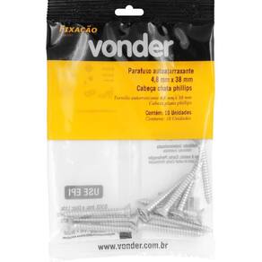 Marca: VonderConteúdo da Embalagem:1 Cartela com 10 parafusosDestaques e diferenciais:Possui acabamento zincado que aumenta a resistência contra corrosão/oxidação. Conta com cabeça chata/cônica que oferece acabamento rente à superfície.Aplicações e dicas de uso:Indicado para fixações de acessórios e objetos em paredes de alvenaria e concreto com buchas de fixação. Permite fixações em móveis tubulares, equipamentos fabricados com chapas metálicas finas e esquadrias de alumínio. Muito utilizado na fabricação de móveis em madeira e MDF.Características Técnicas:Material do parafuso autoatarraxante: Aço carbono Acabamento do parafuso autoatarraxante: Zincado Diâmetro da rosca do parafuso autoatarraxante: 4,8 mm Comprimento do parafuso autoatarraxante: 38,0 mm Tipo da cabeça do parafuso autoatarraxante: Chata Tipo da fenda do parafuso autoatarraxante: Phillips fenda cruzada Marca: Não Informado