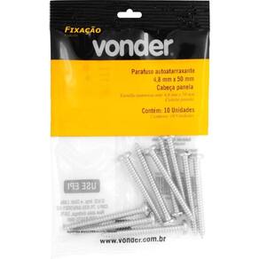 Marca: VonderConteúdo da Embalagem:1 Cartela com 10 parafusosDestaques e diferenciais:Possui acabamento zincado que aumenta a resistência contra corrosão/oxidação. Conta com cabeça base plana que oferece melhor fixação.Aplicações e dicas de uso:Indicado para fixações de acessórios e objetos em paredes de alvenaria e concreto com buchas de fixação. Permite fixações em móveis tubulares, equipamentos fabricados com chapas metálicas finas e esquadrias de alumínio. Muito utilizado na fabricação de móveis em madeira e MDF.Características Técnicas:Material do parafuso autoatarraxante: Aço carbono Acabamento do parafuso autoatarraxante: Zincado Diâmetro da rosca do parafuso autoatarraxante: 4,8 mm Comprimento do parafuso autoatarraxante: 50,0 mm Tipo da cabeça do parafuso autoatarraxante: Panela Tipo da fenda do parafuso autoatarraxante: Simples Marca: Não Informado
