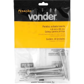 Marca: VonderConteúdo da Embalagem:1 Cartela com 10 parafusosDestaques e diferenciais:Possui acabamento zincado que aumenta a resistência contra corrosão/oxidação, além de cabeça tipo phillips, que proporciona maior força de aperto e menor possibilidade da chave ou bits escapar e riscar a peça que está sendo trabalhada.Aplicações e dicas de uso:Indicado para fixações de acessórios e objetos em paredes de alvenaria e concreto com buchas de fixação. Permite fixações em móveis tubulares, equipamentos fabricados com chapas metálicas finas e esquadrias de alumínio. Muito utilizado na fabricação de móveis em madeira e MDF.Características Técnicas:Material do parafuso autoatarraxante: Aço carbono Acabamento do parafuso autoatarraxante: Zincado Diâmetro da rosca do parafuso autoatarraxante: 4,8 mm Comprimento do parafuso autoatarraxante: 50,0 mm Tipo da cabeça do parafuso autoatarraxante: Panela Tipo da fenda do parafuso autoatarraxante: Phillips fenda cruzada Marca: Não Informado