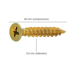 Dimensões: 3,5 mm (diâmetro) x 40 mm (comprimento)Cabeça: Chata, proporcionando um acabamento niveladoFenda: Philips, que assegura um encaixe firme e fácil aplicaçãoQuantidade: 500 unidades por embalagemMaterial: Aço de alta qualidade, resistente e durávelAplicações: