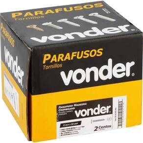 Especificações Diâmetro: 6,0 mm Comprimento: 50 mm Tipo de fenda: Fenda cruzada/phillips Cabeça: Flangeada Material: Aço carbono Tratamento: Bicromatizado (zincado amarelo) Massa aproximada (peso): 0,956 kg Itens Inclusos 200 Parafuso Madeira 6,0 x 50 mm Chipboard Flangeado Vonder Indicações de Uso Montagem de móveis de madeira em ambientes internos Fixação de estruturas de madeira em construções e reformas Instalação de forros e revestimentos de madeira Projetos de marcenaria que exigem alta resistência e durabilidade Perguntas Frequentes (FAQ) Pergunta: Qual o material do parafuso?