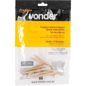 Marca: VonderConteúdo da Embalagem:1 Cartela com 10 parafusos madeiraDestaques e diferenciais:Possui acabamento bicromatizado, que aumenta a resistência contra corrosão/oxidação, além de cabeça tipo phillips, que proporciona maior força de aperto e menor possibilidade da chave ou bits escapar e riscar a peça que está sendo trabalhada.Aplicações e dicas de uso:Indicado para fixações em madeiras e derivados, como: aglomerados, pinus, MDF, entre outros.Características Técnicas:Tipo de cabeça do parafuso madeira: Chata - fenda cruzada/phillips Diâmetro do parafuso madeira: 4,5 mm Comprimento do parafuso madeira: 40,0 mm Material do parafuso madeira: Aço carbono Marca: Não Informado Ean: 7893946625719