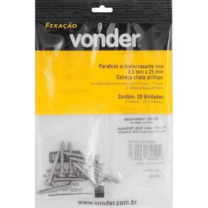 Marca: VonderConteúdo da Embalagem:1 Cartela com 10 parafusosDestaques e diferenciais:Fabricado em aço inox, proporcionando excelente resistência contra corrosão/oxidação. Conta com cabeça chata/cônica que oferece acabamento rente à superfície.Aplicações e dicas de uso:Indicado para fixações de acessórios e objetos em paredes de alvenaria e concreto com buchas de fixação. Permite fixações em móveis tubulares, equipamentos fabricados com chapas metálicas finas e esquadrias de alumínio. Muito utilizado na fabricação de móveis em madeira e MDF.Características Técnicas:Material do parafuso autoatarraxante: Inox Acabamento do parafuso autoatarraxante: N/A Diâmetro da rosca do parafuso autoatarraxante: 3,5 mm Comprimento do parafuso autoatarraxante: 25,0 mm Tipo da cabeça do parafuso autoatarraxante: Chata Tipo da fenda do parafuso autoatarraxante: Phillips fenda cruzada Marca: Não Informado