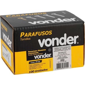 Especificações Diâmetro: 6,0 mm Comprimento: 70 mm Tipo de Cabeça: Flangeada Formato da Ponta: Phillips Material: Aço carbono com acabamento bicromatizado Quantidade: 100 unidades Itens Inclusos 100 Parafusos para Madeira 6,0x70mm Cabeça Flangeada Phillips Vonder Perguntas Frequentes (FAQ) Pergunta: Qual o tipo de madeira que este parafuso suporta?