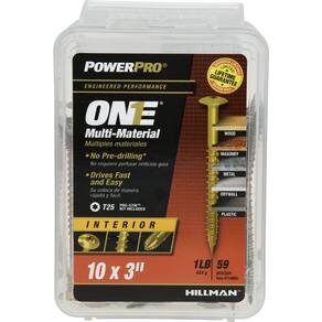 Parafusos de cabeça de pastilha multimaterial Power Pro Premium One, aço zincado amarelo, fixados em madeira, metal, concreto, drywall e plástico, amarelos, #10 x 3 polegadas, caixa com 59 parafusos