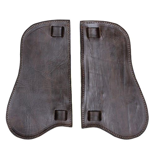 Um Par de Paralamas da nossa marca exclusiva Bronc-Steel, fabricados em couro de alta qualidade na cor Marrom com parte interna em feltro, com costuras reforçadas e passadores em couro para os loros. Utilizado em selas e arreios com loros de até 3,5cm de largura.