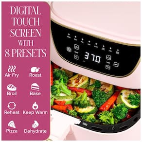O painel digital touchscreen iluminado oferece 8 funções de cocção com ajuste de tempo e temperatura entre 90°C e aproximadamente 204°C. A estrutura em plástico na cor rosa comporta cesto e bandeja removíveis compatíveis com lava-louças, facilitando a limpeza após o uso.